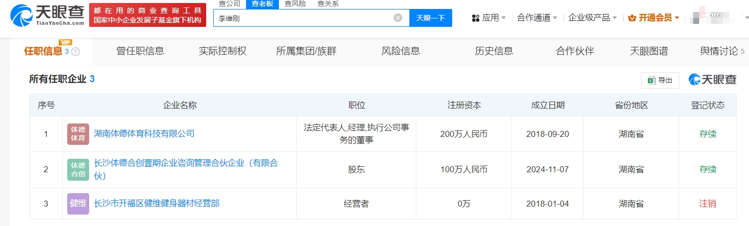 其中,湖南体德体育科技有限公司成立于2018年9月,法定代表人、经理、执行公司事务的董事为李维刚,注册资本200万人民币,经营范围含软件开发、体育健康服务、健身休闲活动、餐饮服务、食品销售等,由长沙体德控股有限公司全资持股。