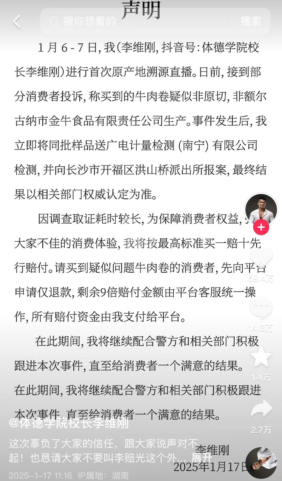 1月17日,@体得学院校长李维刚发布视频,就此前带货的“原切牛肉卷非原切”一事道歉。