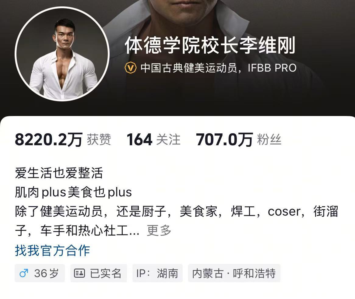 截至发稿前,抖音账号体得学院校长李维刚粉丝数已涨至707万。